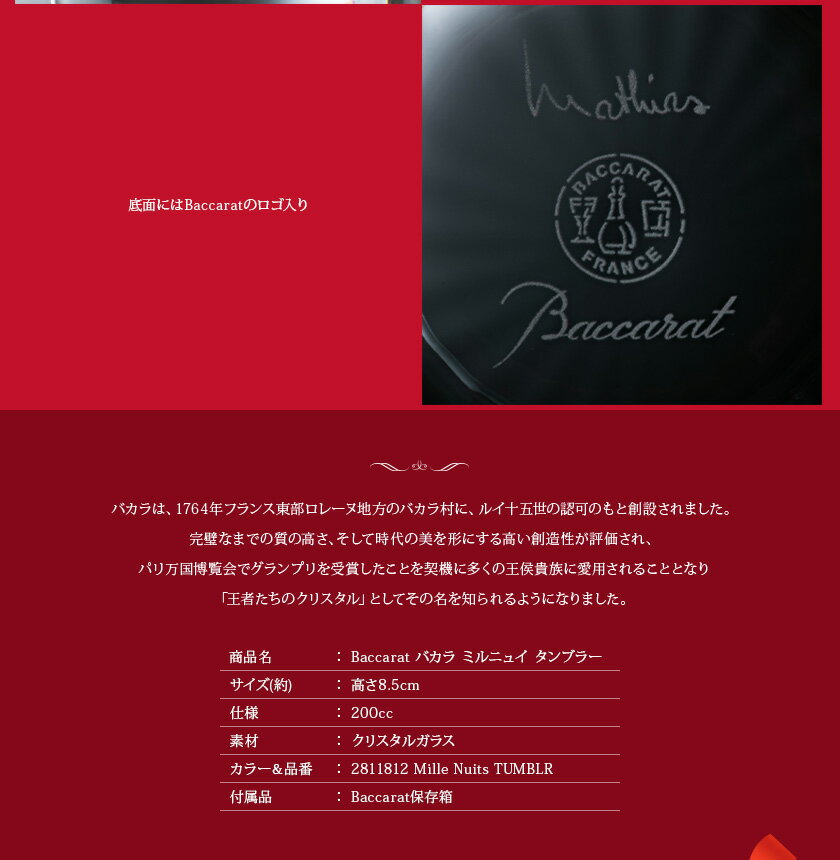 サイズ(約) 200ml 仕様クリアクリスタル製タンブラー素材クリスタルガラスカラー&品番ミルニュイ タンブラー 2811812付属品Baccarat化粧箱注目キーワード法人記念品 名入れ大量注文 セール プレゼント 結婚祝い 内祝い 御祝返し 新築祝い 引っ越し祝い 新生活 ギフト 贈り物 ギフトセット おしゃれ かわいい ガラス製品 ガラス食器 正規品コード:名10スタッフコメントイベントなどの大切な記念日の贈り物はもちろん、季節のギフトや誕生日プレゼント 結婚祝い 内祝い 御祝返し 新築祝い 引っ越し祝い 新生活 ギフトとしてお選び頂いております。