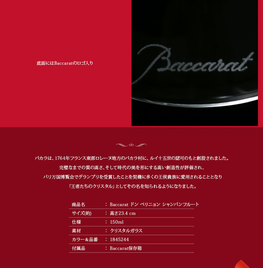 商品名 バカラ Baccarat ドン ペリニョン シャンパンフルート 1客 1845244 サイズ(約) 高さ23.4 cm 口径5 cm 仕様 150ml 素材 クリスタルガラス カラー&品番 1845244 付属品 Baccarat 化粧箱 注目キーワード食器 グラス コップ 高級 ブランド シンプル 誕生日 結婚祝い 贈り物 実用的 シャンパン グラス シャンペン ドンペリ セット ペアセット ギフトセット 内祝い お返し プレゼント ギフト 熨斗 新品 正規品 セール 特別なギフトを演出する名入れオプション。